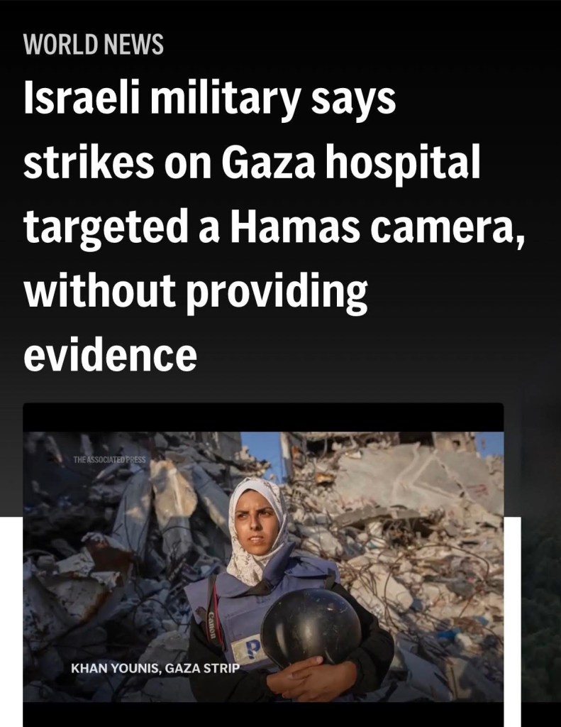 The Indiscriminate Killing Has To End… The Israeli military said Tuesday that its double strike on a Gaza hospital that killed 20 people targeted what it believed was a Hamas surveillance camera. But the first strike killed a cameraman from the Reuters news agency doing a live television shot, according to witnesses and health officials. I literally hate the word Collateral Damage, it’s typically used to dehumanize the killing of innocent civilians or noncombatants.