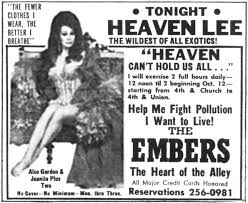 This wasn’t like todays topless bars where women just dance around a bit, Heaven Lee performed an artful burlesque show with themes, props and sometimes a little audience participation.